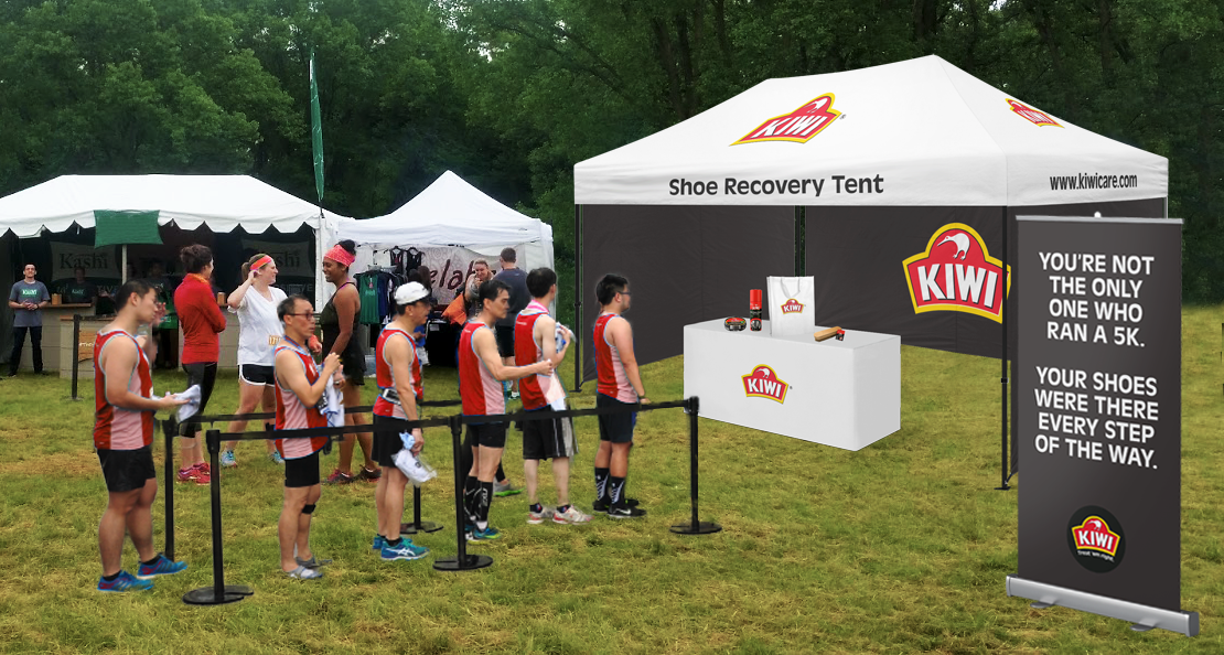 Give away booths set up at 5k's, 10k's, and marathons to help shoes recover from their big races. They will showcase Kiwi's line of products for athletic and running shoes.
